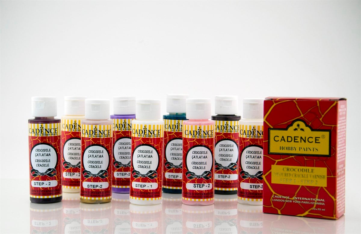 وهو عبارة عن وسط مائي ذو مرحلتين يعطي مظهر "التمساح" الملون (جلد التمساح). تتوفر خيارات ألوان مختلفة. يمكن التحكم في تأثير التكسير من خلال سمك التطبيق. يوصى بوضع طبقتين للشقوق الواسعة. أولا، يتم تطبيق الخطوة 1 على السطح بأكمله. إذا تم استخدام الفرشاة أفقيًا، فسيكون هناك توزيع متساوي على الكائن. من المهم أن تكون الفرشاة جافة. بعد أن يجف تمامًا (أي عندما تصبح الخطوة 1 شفافة)، يتم تطبيق الخطوة 2 وتترك لتجف بشكل طبيعي. يتم استخدام Cadence Spray Varnish لإنهاء العملية. لا يحتوي على مواد ضارة بالصحة. يتوافق مع معايير CE وEN 71.