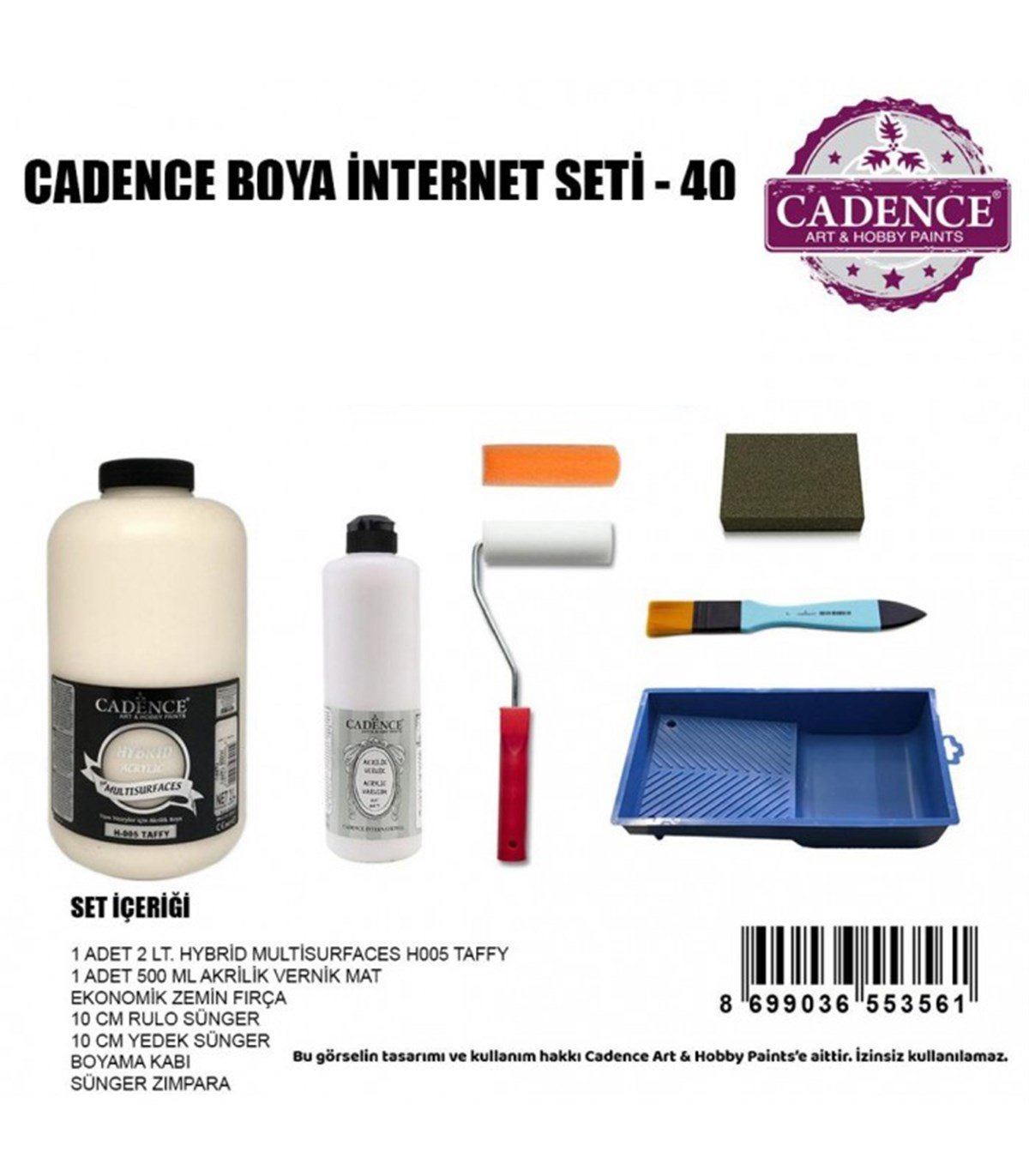 Cadence Paint Set 40; Contains 2 Liters H005-Taffy Hybrid Multisurface paint, 500 Ml Matte Varnish, sponge roller, velvet coated spare nozzle, sponge sander, economical floor brush and paint roller pan. . With this set, 4 doors or a standard size bedroom set, dining room set or living room set can be easily painted. It is sufficient amount of paint for approximately 16 square meters of area.