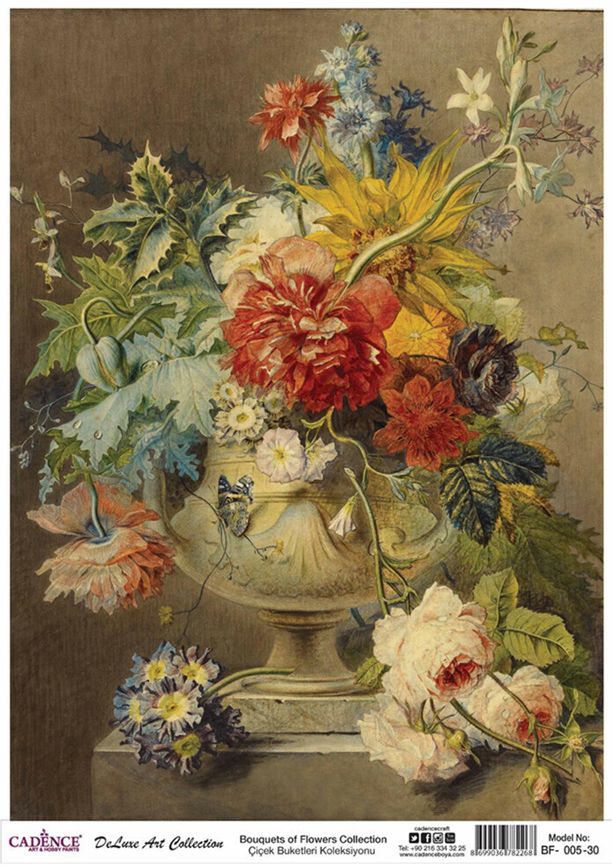Rice paper decoupages in various sizes are printed on thin paper made from paddy straw. It is an easy-to-use, thin and resistant decoration material that can be used with Cadence Decoupage Plus on all kinds of surfaces for decoupage works. Thanks to the advantage of thousands of models and various sizes, you can take your works to a different dimension by choosing the pattern and size that best suits your works.