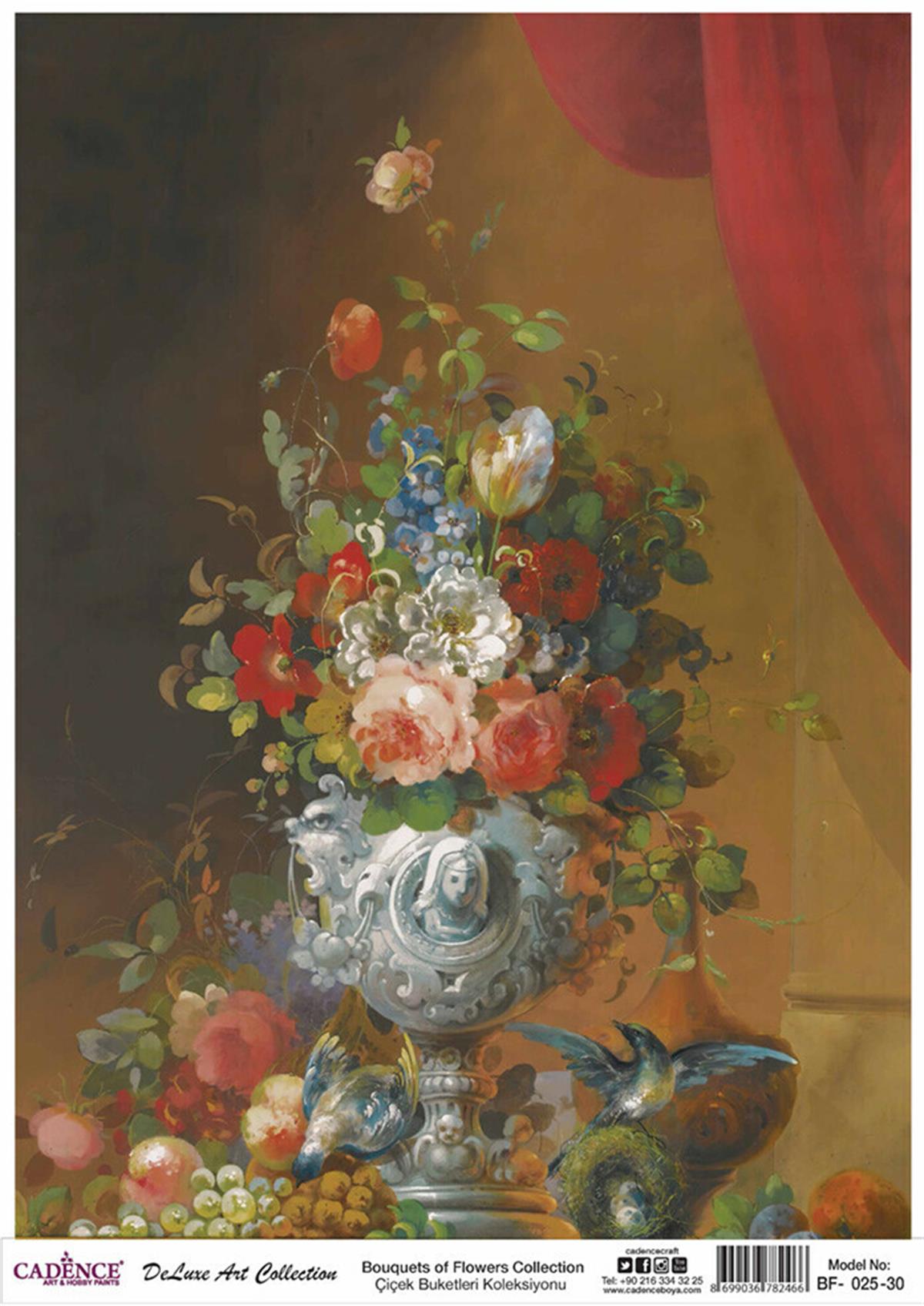 Rice paper decoupages in various sizes are printed on thin paper made from paddy straw. It is an easy-to-use, thin and resistant decoration material that can be used with Cadence Decoupage Plus on all kinds of surfaces for decoupage works. Thanks to the advantage of thousands of models and various sizes, you can take your works to a different dimension by choosing the pattern and size that best suits your works.