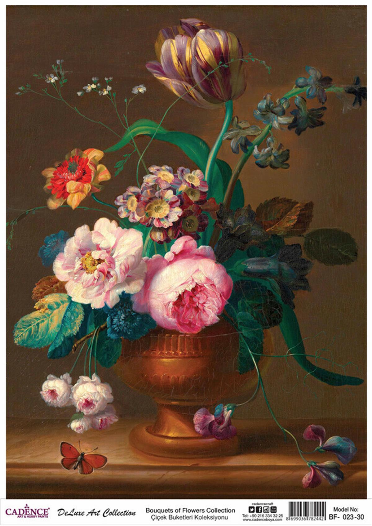 Декупажи из рисовой бумаги разных размеров печатаются на тонкой бумаге из рисовой соломки. Это простой в использовании, тонкий и прочный декоративный материал, который можно использовать с Cadence Decoupage Plus на всех видах поверхностей для декупажа. Благодаря тысячам моделей и различным размерам вы можете перенести свои работы в другое измерение, выбрав узор и размер, которые лучше всего подходят вашим работам.